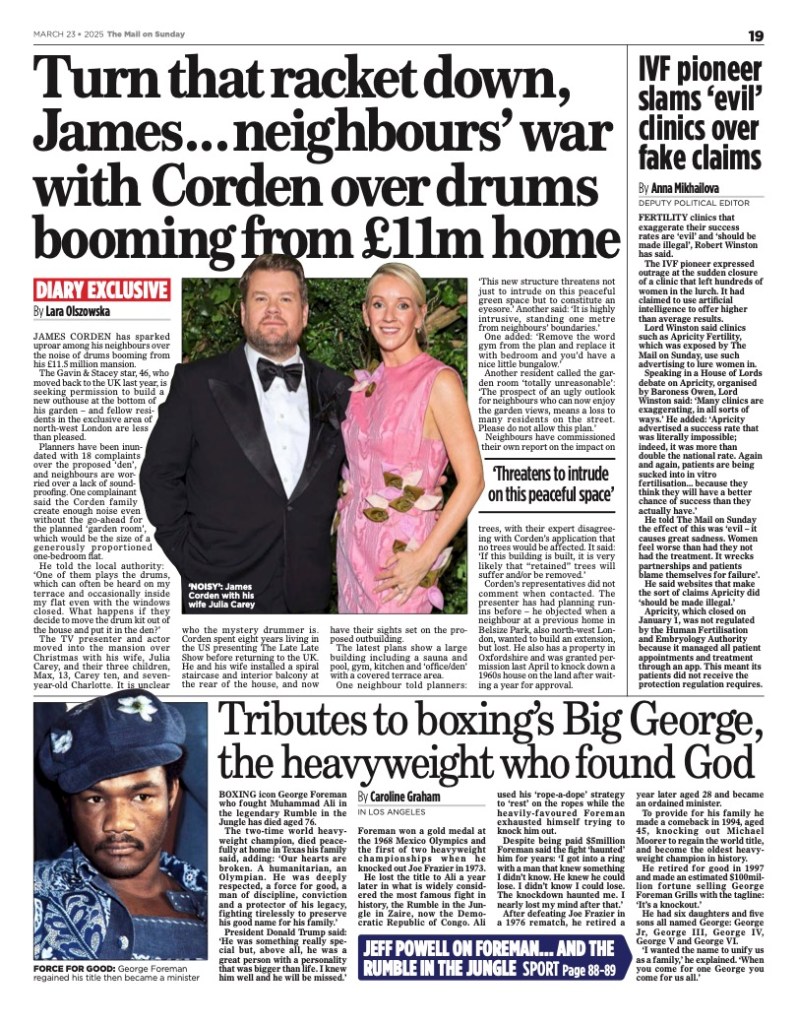 - James Corden’s furious neighbours lash out over the noise of drums booming from star’s £11.5m mansion – Mail on Sunday