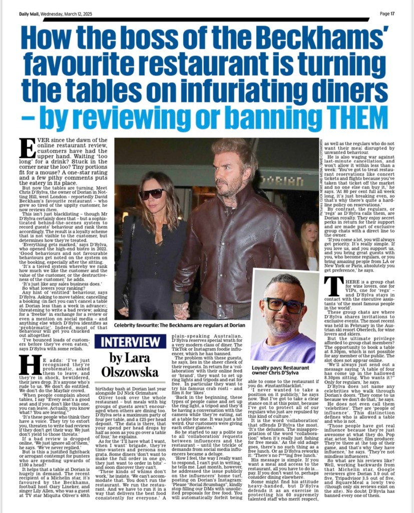 - How the boss of the Beckhams’ favourite restaurant is turning the tables on infuriating diners – by reviewing or banning THEM – Daily Mail
