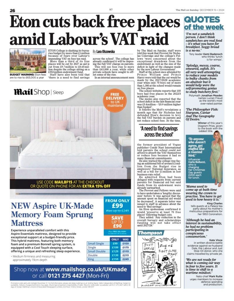 - Eton College slashes a third of its free places amid fears over Labour’s VAT tax raid – Mail on Sunday