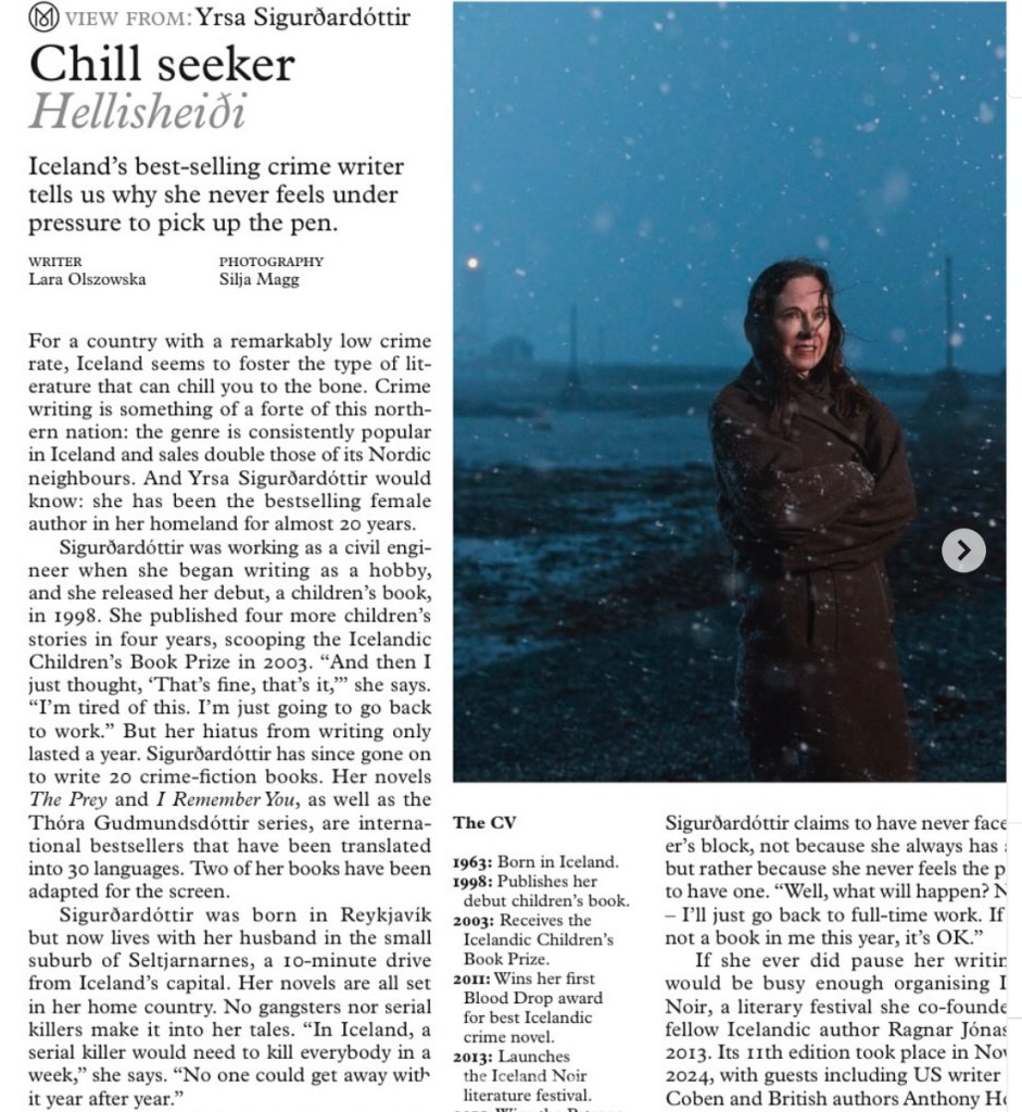 - Chill Seeker: Iceland’s best-selling crime writer tells us why she never feels under pressure to pick up the pen – Monocle [print]